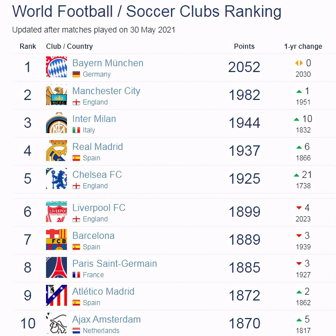 北京时间6月1日消息,国外网站Football Database公布了最新一期世界俱乐部排行,拜仁、曼城、国米仍居前3,新科欧冠冠军切尔西升至第3。亚洲俱乐部方面,川崎前锋、利雅得新月、波斯波利斯位列前三。