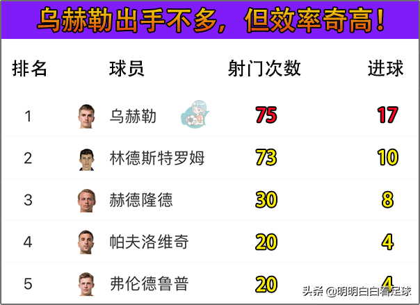 要知道,作为人类射门精华之一,C罗上赛季是168次射门进了23个(不含点球),每进1个所需要的射门次数比乌赫勒都多了快两倍。