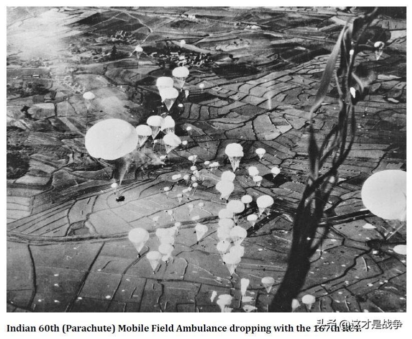 第二、会跳伞的医疗兵你见过吗?1951年3月,美军发起“战斧行动”,动用空降第187团战斗队在汶山里空降,意欲切断人民军第1军团的后路,并歼灭之。后因人民军第1军团已撤退,改为试图歼灭志愿军26军。此次战斗,印度第60野战医疗队配属给了美军空降第187团战斗队,一起从C-47飞机上跳了下去。我们来看下美军战地记者拍下的照片,大家自己看照片说明:印度第60野战救护队和空降第187团战斗队一起降落。见下图。