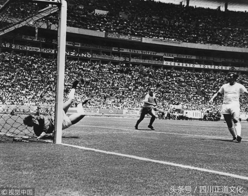 1970年墨西哥世界杯小组赛,英格兰对阵巴西队,英格兰队守门员戈登·班克斯完成了足球史上非常著名的一次扑救后扑落地。巴西球员贝利将球顶向无人防守的远门柱后,已经转身准备庆祝了,班克斯在门线上用指尖把球挡了出去。这次扑救后来被人们称为“世纪扑救”。(Photo by Keystone/Getty Images)