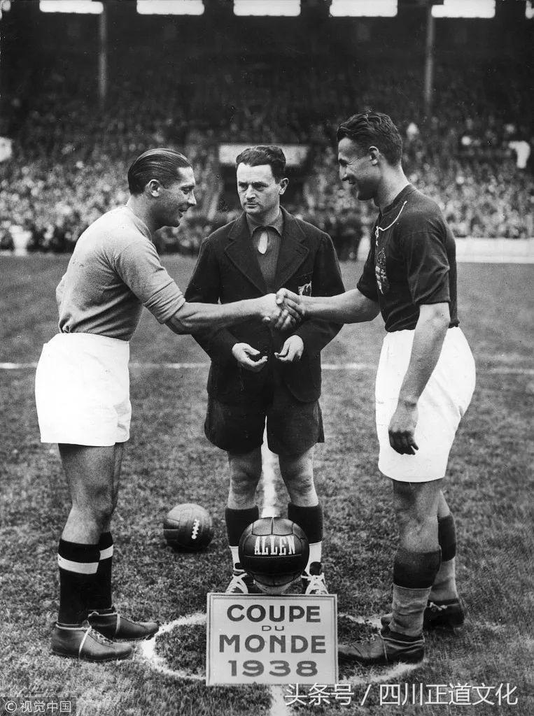 1938年6月19日,意大利队长朱塞佩·梅亚查(左)在法国世界杯决赛开始时与匈牙利队长萨洛西握手。意大利以4:2击败匈牙利,成为世界冠军。(Photo by Keystone/Getty Images)