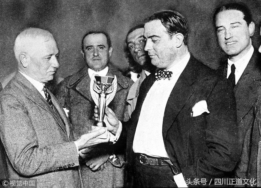 1930年世界杯决赛,乌拉圭4:2战胜了阿根廷队。国际足联主席雷米特向乌拉圭足球协会主席劳尔·裘德介绍奖杯。(Photo by Popperfoto/Getty Images)