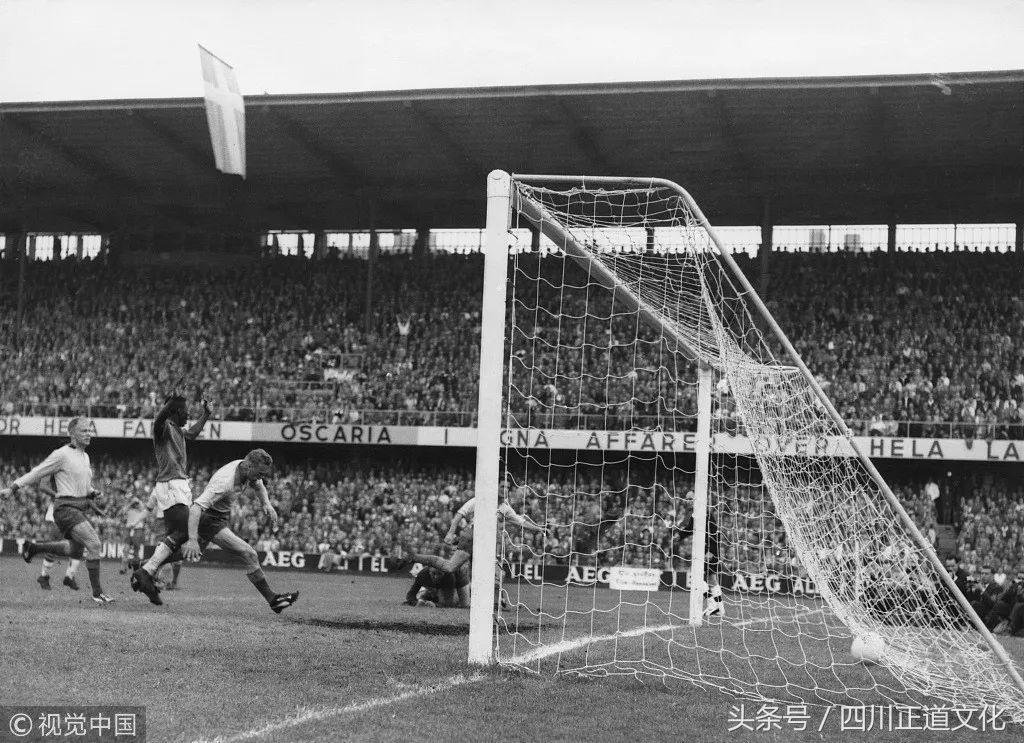 1958年6月29日,世界杯决赛,瑞典Vs巴西,未满17岁的巴西球员贝利崭露头角,决赛下半场第55分钟,贝利打进了他那个著名的进球,从头顶挑过后卫,随后凌空抽射将球射入网窝。多年后,贝利仍称这个进球是他最难忘的一个,而被他挑球骗过的瑞典后卫帕林也被这个进球折服,赛后称自己当时几乎要冲上去和贝利一同庆祝这精彩的进球。最终,巴西队5:2战胜了东道主瑞典队。(Photo by Popperfoto/Getty Images)