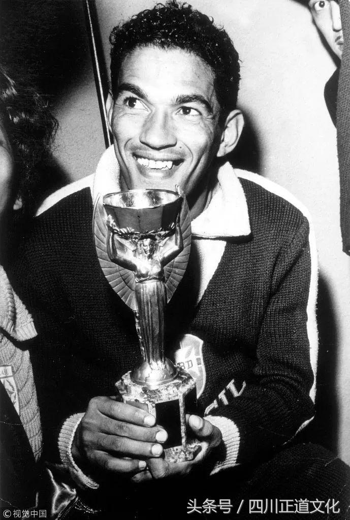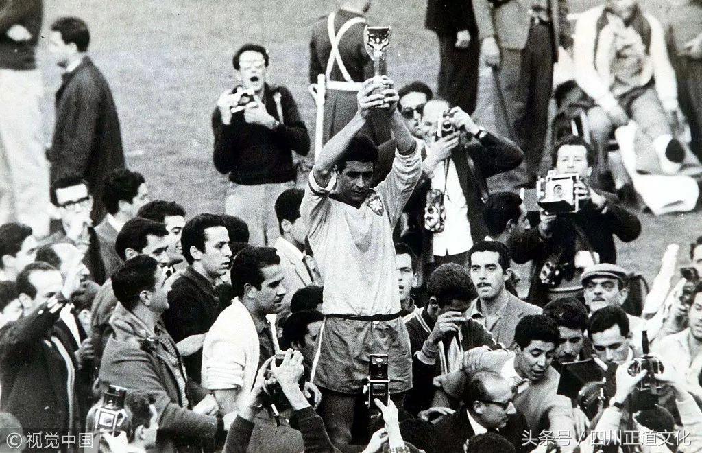 1962年6月17日,智利,世界杯决赛,巴西3:1捷克斯洛伐克,巴西球员加林查赛后手捧雷米特杯。1983年1月20日,因酗酒而饱受病魔折磨的加林查溘然长逝,年仅49岁,为纪念他的伟大功绩,巴西政府把2014世界杯揭幕式主场改名加林查球场。(Photo by Popperfoto/Getty Images)