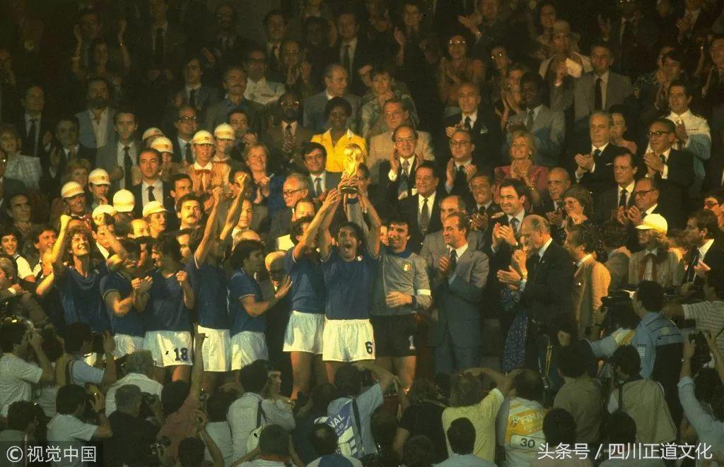 1982年7月11日,西班牙马德里的伯纳乌球场,意大利队在决赛中战胜西德队,获得冠军,意大利成为巴西之后,第2个3度获得世界杯冠军的国家。同时,自1982年起,世界杯都会颁发金球奖,用以表彰在决赛阶段表现最优秀的球员的奖项,第一届世界杯金球奖由意大利球员罗西获得。(Allsport UK /Allsport)