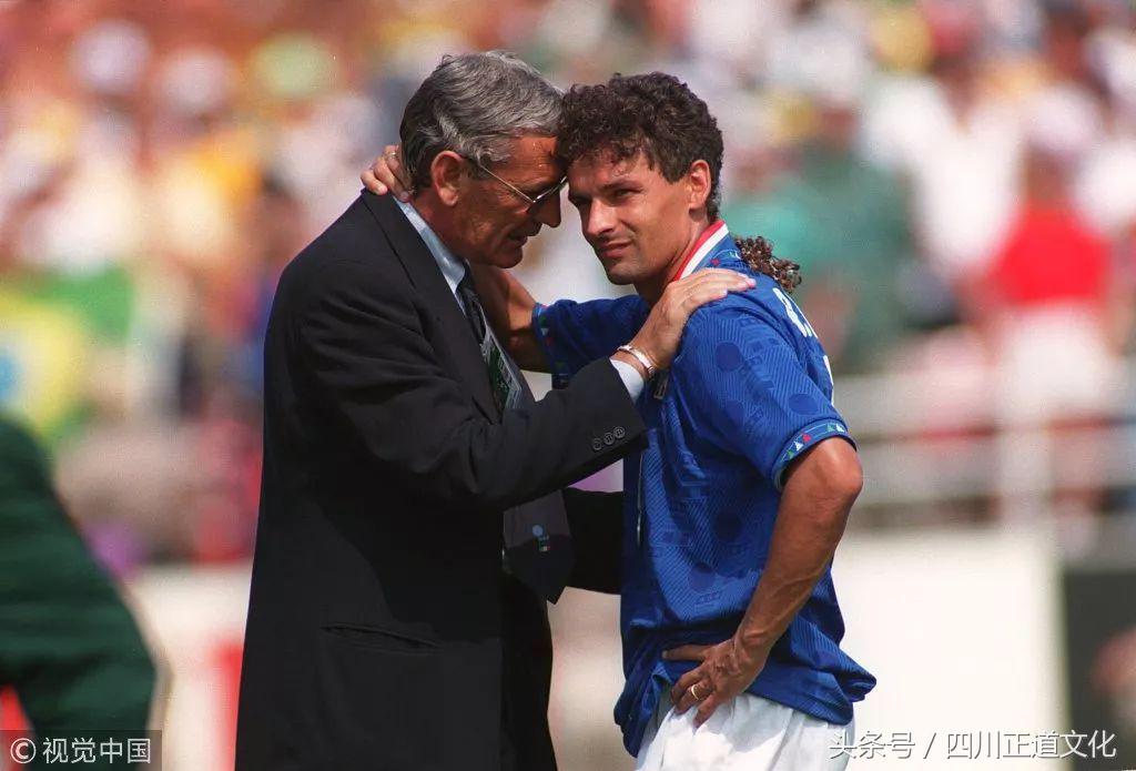 罗伯特·巴乔罚丢点球后,时任意大利领队的里瓦安慰巴乔。( Ben Radford/ALLSPORT)