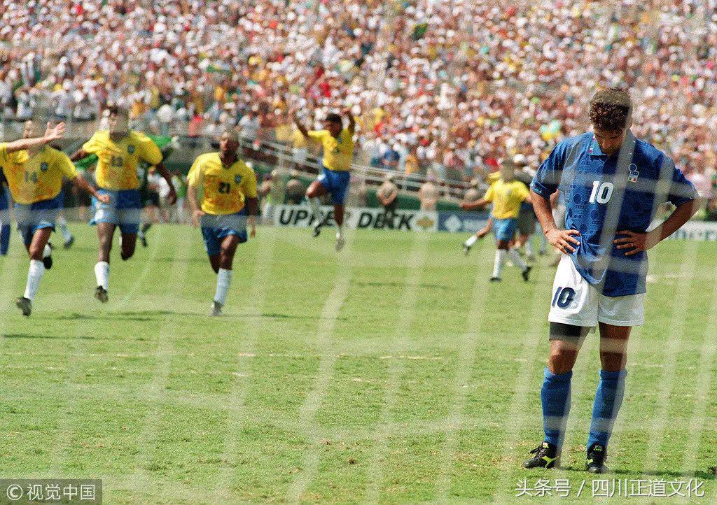 1994年7月17日,美国加利福尼亚,玫瑰碗球场。世界杯决赛,巴西Vs意大利。意大利前锋罗伯特·巴乔罚丢了世界杯历史上几乎最知名的一次点球。这个夏天,当巴乔站在一生中几乎最重要的时刻,他与幸福擦肩而过。他忧郁的身影也被球迷所牢记。最终,巴西队战胜了意大利队。美国玫瑰碗球场与中国也有些渊源,5年之后的1999年,女足世界杯决赛也是在这块场地上举行的,当时的中国女足在点球大战中惜败给了东道主美国队,屈居亚军。(AFP PHOTO/OMAR TORRES)