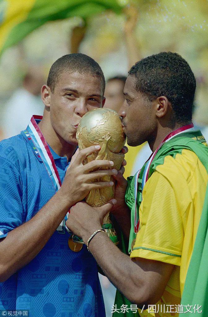 赛后,17岁的巴西球员罗纳尔多(左)亲吻大力神杯。这是罗纳尔多职业生涯的第一次大赛经历,他没有获得出场机会。(Photo by Mike Hewitt/Getty Images)