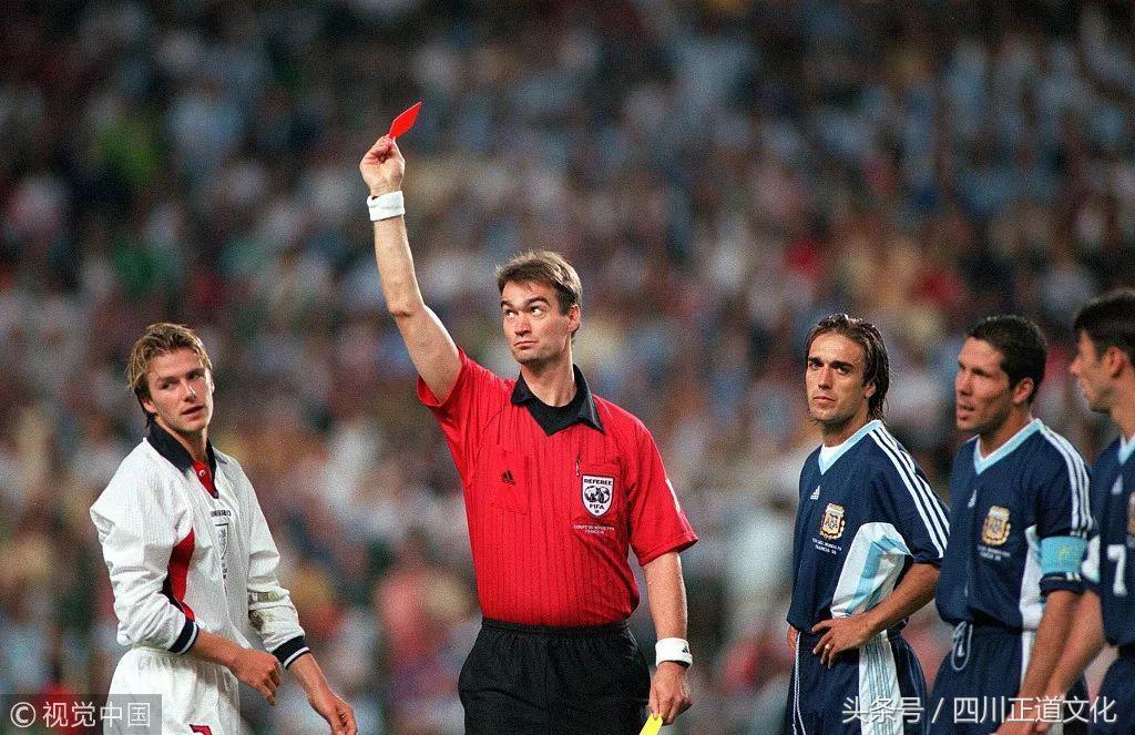 1998年6月30日,1998世界杯1/8决赛,又是举世瞩目的英阿大战,最终阿根廷4:3英格兰(点球),英格兰球员贝克汉姆(左一)在比赛中因报复性地勾倒了西蒙尼(右二)被红牌罚下。赛后,贝克汉姆受到了国内舆论的强烈谴责,陷入人生低谷,从万千喜爱的宠儿变成了被人口诛笔伐的英伦弃儿。法兰西的红牌与他标志性的贝氏弧线一起,长久地留在了人们的记忆之中。而被他勾倒的阿根廷球员西蒙尼,现在是西班牙马德里竞技队的主教练,并在2016年获得国际足球历史和统计联合会颁发的的年度最佳教练。(Photo by Bob Thomas/Getty Images)