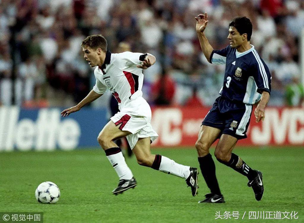 英格兰与阿根廷的这场比赛,还让人们记住了英格兰18岁的前锋,追风少年迈克尔·欧文(左),他在本场比赛中上演长途奔袭,打入一球。这也是欧文职业生涯的成名作。(Ross Kinnaird /Allsport)