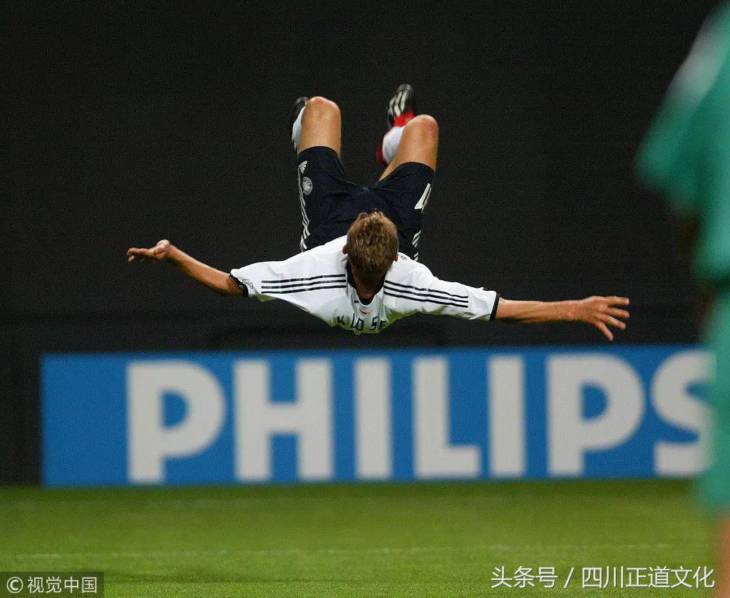 2002年6月1日,韩日世界杯,德国8-0沙特。德国前锋克洛泽在进球后空翻庆祝。截至2014年巴西世界杯,克洛泽个人在世界杯决赛阶段出场24次,攻入16球,是世界杯历史上总射手榜榜首。 (Photo by Laurence Griffiths/Getty Images)