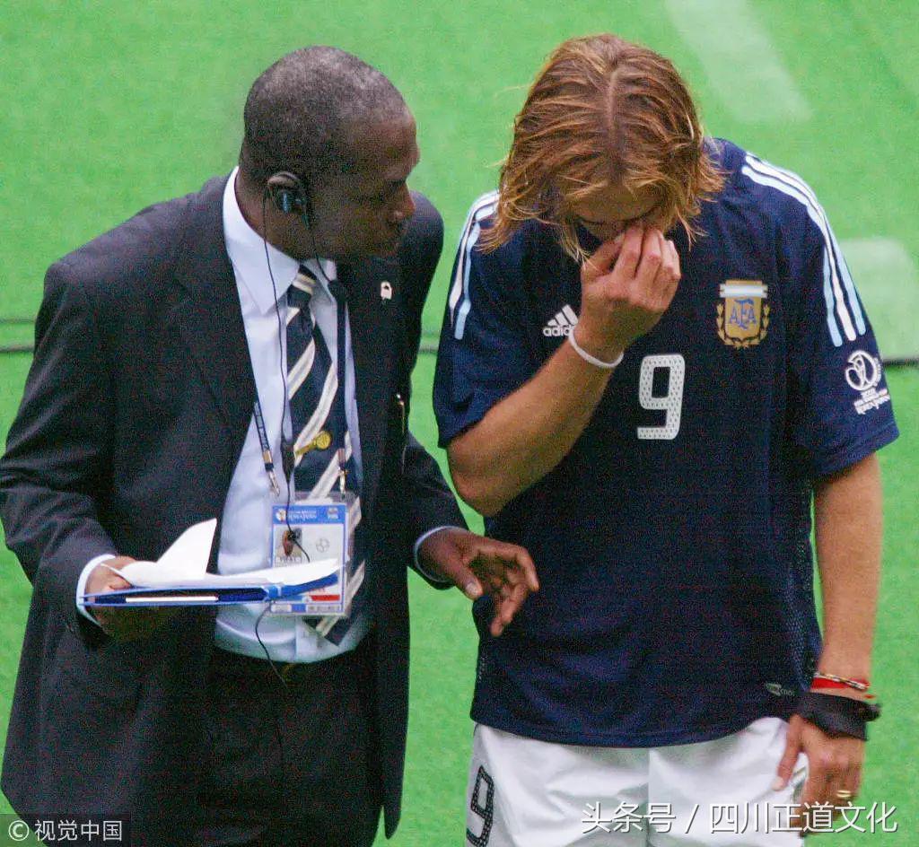 2002年6月12日,日本仙台,阿根廷队被瑞典队逼平,小组赛即遭淘汰,被称为“战神”的阿根廷前锋巴蒂斯图塔在哭泣,这是他的最后一届世界杯。(AFP PHOTO ODD ANDERSEN)