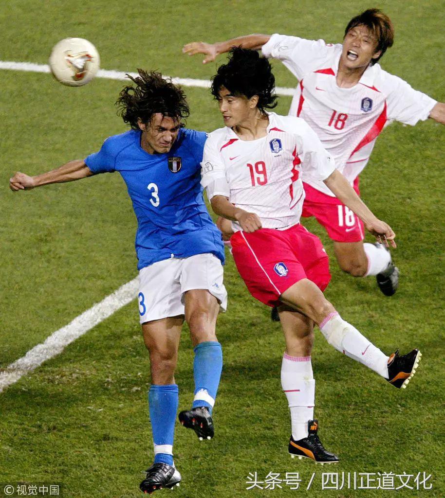 2002年6月18日,韩国2:1意大利。韩国球员安贞焕力压意大利后卫马尔蒂尼,打入打入金球。凭借这个进球,意大利队被淘汰出局。东道主韩国队在此届比赛中先后淘汰意大利、西班牙等强队,最终取得第四名的成绩,但在几场比赛中的裁判判罚,引发了巨大争议。加之之前小组赛意外出局的法国、阿根廷等夺冠热门,那年并不被看好的巴西,在几乎没有遇到太强对手的情况下,最后夺冠。(REUTERS/Lee Jae-won)