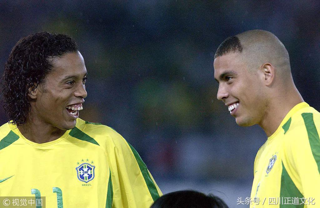 2002年6月30日,日本横滨,决赛,巴西2-0德国,绰号“外星人”的巴西球员罗纳尔多以可爱的阿福头亮相,他在决赛中打入两球,身旁是初出茅庐的罗纳尔迪尼奥。这也是巴西队第五次获得世界杯冠军,成为“五星巴西”。(Claudio Villa/Getty Images/视觉中国)