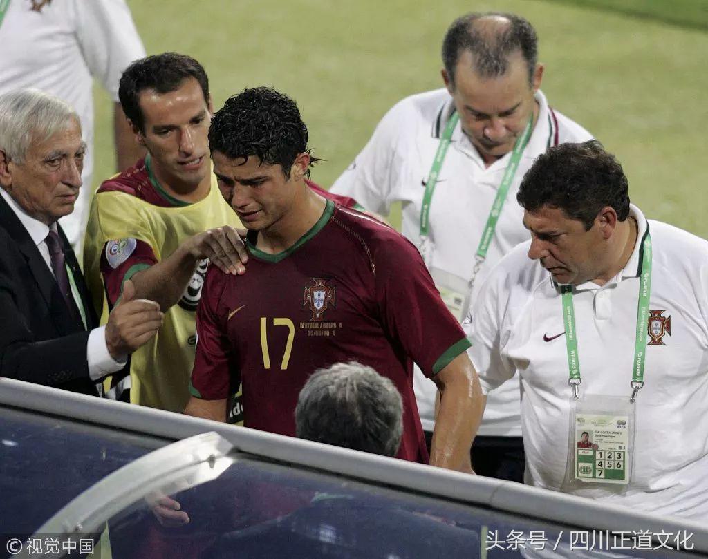 2006年世界杯,在葡萄牙1/8决赛同荷兰队的比赛中,年轻的葡萄牙球员克里斯蒂亚诺·罗纳尔多出战刚刚打了30分钟,就无奈因伤被换下。他在走回替补席后突然失态,放声大哭。(Photo by Alexander Heimann/Getty Images)
