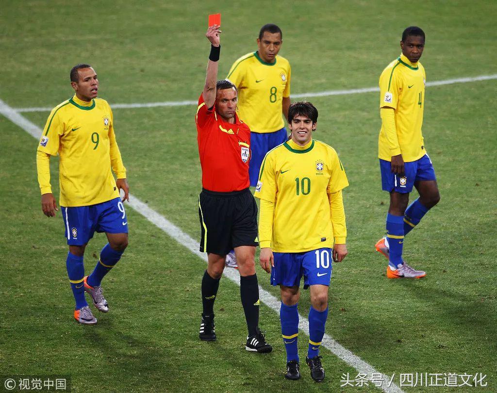2010年6月21日,巴西与科特迪瓦小组赛中,巴西球员卡卡被红牌罚下。这一判罚在赛后也引发了争议。(Photo by Jeff Mitchell - FIFA/FIFA via Getty Images)
