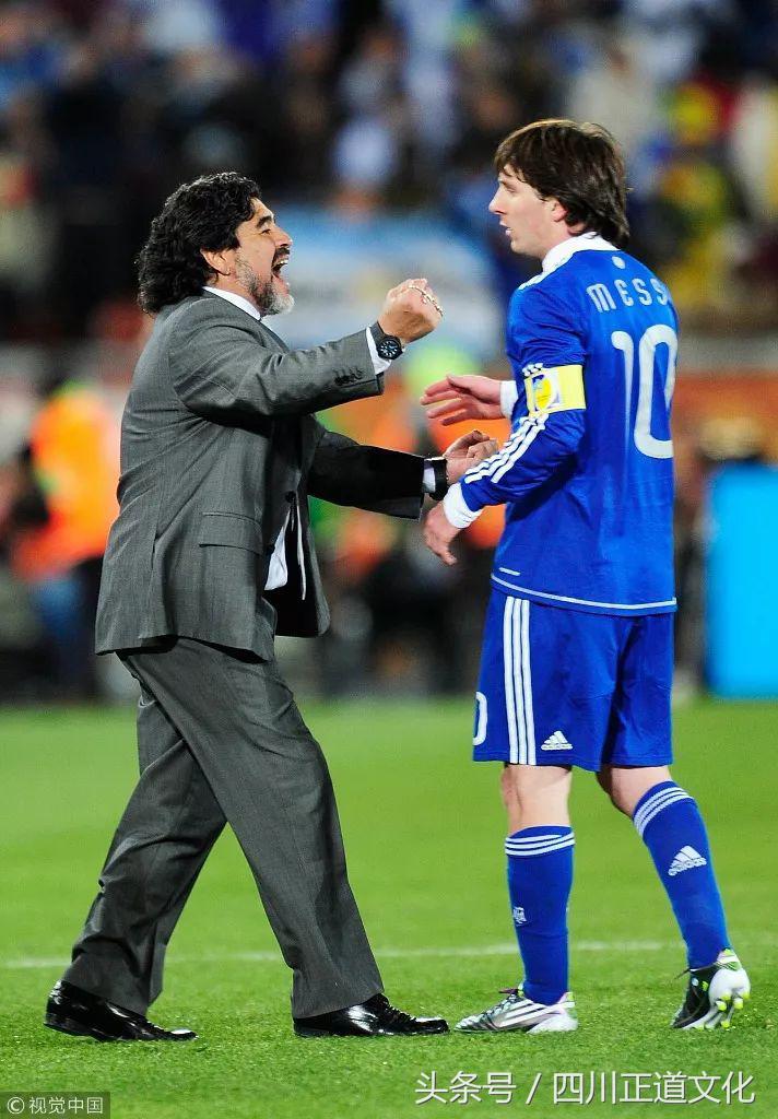 2010年6月22日,南非波罗瓜尼,2010世界杯B组末轮,阿根廷2:0希腊。当年在球场上叱咤风云的马拉多纳已成为了当时阿根廷的主帅,他与梅西在场边庆祝。在1/4决赛中,阿根廷队败给德国队,“马大帅”不久后宣布辞职。 (Photo by Stuart Franklin/Getty Images)