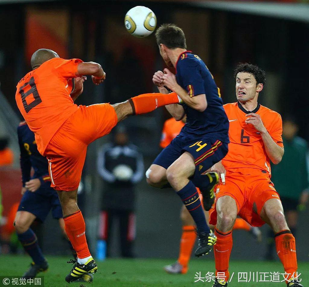 2010年7月11日。南非约翰内斯堡,世界杯决赛,比赛中荷兰中场德容脚直接踹到阿隆索胸口。(BPI / ISI / Polaris)