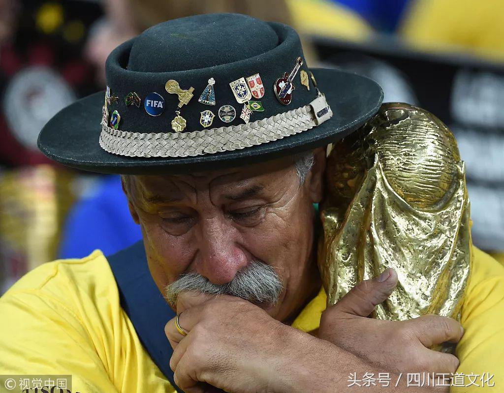 2014年7月8日,巴西米内罗竞技场,2014巴西世界杯半决赛,巴西在主场以1比7的悬殊比败给德国队,被人们称为“金杯爷爷”的巴西球迷克洛维斯-费尔南德斯失声痛哭,赛后,他含泪将手里的“大力神杯”赠给了现场的一名德国女球迷。克洛维斯-费尔南德斯被认为是巴西队的最佳第12人,自1990年起,他在每届大赛上都会亲临现场为巴西队加油助威。据2015年9月18日消息,这位巴西球迷去世。(Focus Images / Barcroft Media)