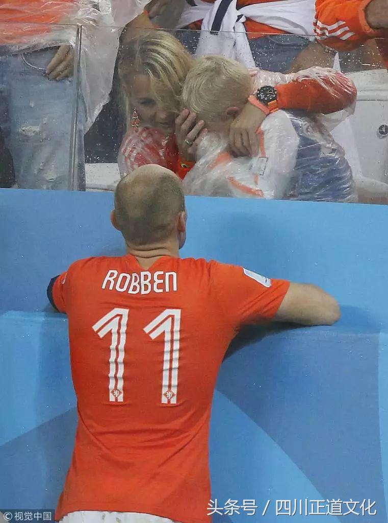 2014年7月9日,巴西圣保罗,半决赛,荷兰队点球2:4不敌阿根廷,荷兰球员罗本安慰场边痛哭的儿子。(Imago)